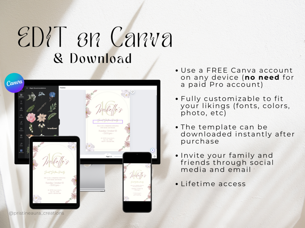 Celebrate this special milestone in style with our Elegant Sweet 16 Birthday Invitation Template. This beautifully designed invitation is perfect for adding a sophisticated touch to your event, and it’s fully customizable with no design experience needed!